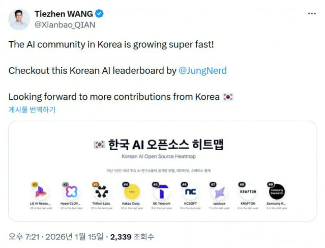 신재민 트릴리온랩스 대표는 "우리 기술이 단순 외부 모델 미세조정이 아니라, 고유한 설계 역량으로 탄생한 진짜 독자 모델임을 글로벌 플랫폼에서 검증받았다는 데 의미가 크다"고 말했다.