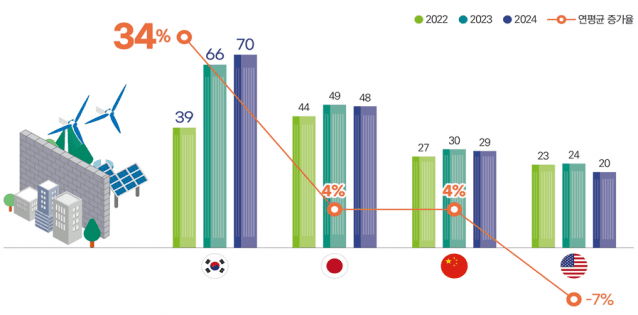 클라이밋 그룹과 탄소공개정보프로젝트(CDP) 위원회가 발간한 RE100 2024 연례보고서에 따르면, 2024년 한국에서 재생에너지 조달에 어려움을 겪은 기업은 미국(20개사)의 3.5배인 70개사로 나타났다. 이는 2022년(39개사)에 비해 약 80% 증가한 수치다. 미국, 일본, 중국 등 주요국은 RE100 이행장벽이 한국과 달리 감소 또는 보합세를 보이는 것으로 나타났다.