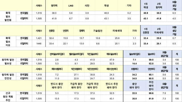 리얼미터 조사결과, 향후 확대가 필요한 발전원은 재생에너지 43.1%, 원자력 41.9%, 액화천연가스(LNG) 6.7% 순으로 나타났다. 원자력 발전 필요성에 대해서는 ‘필요하다’는 의견이 82.0%, ‘필요하지 않다’는 의견은 14.4%로 나타났다. 원자력 발전 안전성에 대해서는 ‘안전하다’는 의견이 60.5%, ‘위험하다’는 의견은 34.0%로 나타났다. 제11차 전기본에 반영된 신규원전 계획 추진 여부의 경우, ‘추진돼야 한다’는 답변이 61.9%, ‘중단돼야 한다’는 답변이 30.8%로 나타났다.