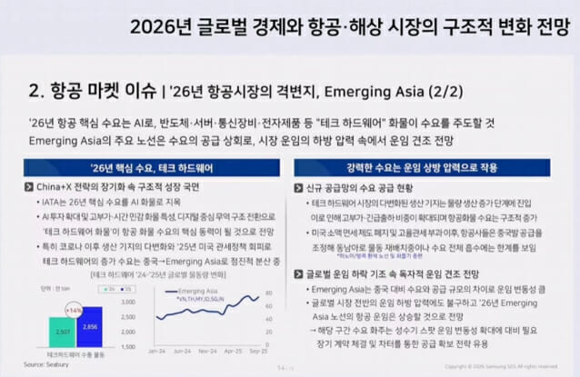 21일 삼성SDS는 '2026년 1분기 및 연간 물류 트렌드 전망' 웨비나를 개최하고 글로벌 경제 기조와 해상·항공 물류 시장 구조적 변화를 분석했다.