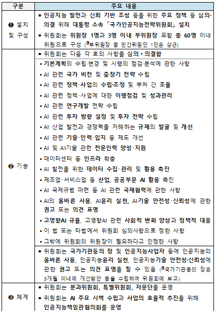 또 심의·의결, 권고·의견 표명 등 위원회 주요 기능이 법률에 명시되며 범정부 AI 정책 총괄·조정을 수행하기 위한 법적 권한이 강화된다.