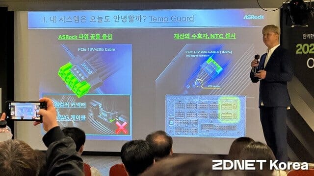 김성현 실장은 "엔비디아 지포스 RTX 5090 등 고성능 그래픽카드는 최대 600W를 소모하는 과정에서 전원 케이블을 녹이는 문제가 발생할 수 있다. 이를 막기 위해 케이블 온도가 섭씨 105도를 넘어서면 전원을 차단하도록 별도 센서를 장착했다"고 설명했다.