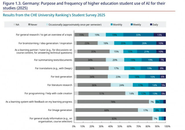 독일 대학생들은 AI를 어떻게 쓸까. 33%가 매주 검색할 때, 26%가 아이디어를 떠올릴 때, 21%가 공부 파트너로, 19%가 요약할 때, 19%가 번역할 때 쓴다. 흥미로운 건 33%가 AI를 '함께 공부하는 친구'처럼 생각한다는 점이다. AI가 단순한 도구를 넘어섰다는 뜻이다.