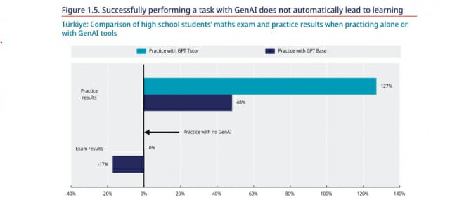 OECD 보고서가 소개한 터키 실험은 충격적이다. 터키 고등학생들이 수학 문제를 풀 때 GPT-4라는 AI를 사용했다. 일반 GPT-4를 쓴 학생들은 연습 점수가 48% 올랐고, 학습을 도와주도록 만든 GPT-4를 쓴 학생들은 무려 127%나 올랐다. 학생들과 부모들은 'AI가 정말 도움이 된다'고 생각했다.
