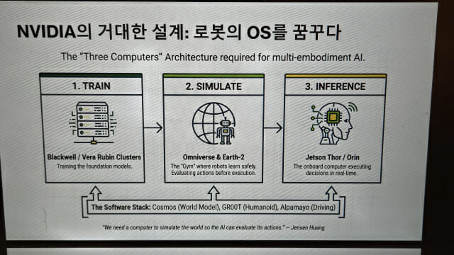 현대자동차와 엔비디아는 이번 CES 2026에서 짜맞추기라도 한 듯, 같은 시각에 동시에 키노트를 하기로 돼 있었는데, 엔비디아 시설에 문제가 생기면서 젠슨 황이 현대차보다 15분 정도 뒤에 발표를 했다. 정 파트너는 "이 모습(같은 시간에 발표)을 보고 보통일이 아니다고 생각했다"고 들려줬다. 엔비디아와 현대차간 협력이 구글과 삼성의 스마트폰 동맹과 비슷하다는 것이다. 최근 현대차는 엔비디아 출신 박민우 사장을 영입, 자율주행본부장을 맡기기도 했다.