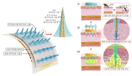 최소 72시간, 길게는 수개월까지도 통증없이 피부 부착이 가능한 벌침 모사형 마이크로 니들이 세계 최초로 개발됐다.