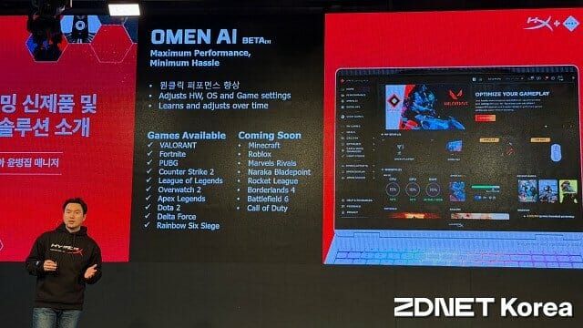 클릭 한 번으로 게임에 맞게 각종 성능을 최적화하는 '오멘 AI'도 지원 게임을 확대할 예정이다. 리그오브레전드, 발로란트에 이어 로블록스, 마인크래프트, 배틀필드6 등이 지원 게임에 추가된다.