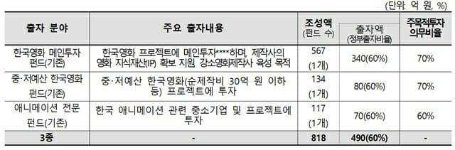 ‘중저예산 한국영화 펀드(조성목표 134억 원)’와 ‘애니메이션 전문 펀드(조성목표 117억 원)를 통해 한국 영화의 작품 다양성과 중·저예산 영화 제작 저변을 확대하고, 우수한 원천 지식재산(IP)에 기반한 애니메이션의 제작과 극장용 한국 애니메이션의 제작을 뒷받침한다.