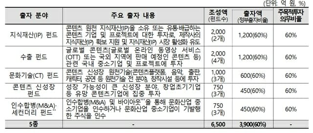 문체부는 모태펀드 문화계정에 지난해 대비 900억원 증가한 총 3천900억원을 출자해 5개 분야, 총 6천500억원 규모의 자펀드 결성을 추진한다.
