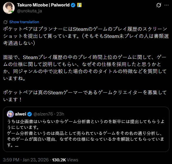 글로벌 흥행작 '팰월드'를 개발한 포켓페어의 미조베 타쿠로 대표가 밝힌 필수 채용 조건이다. 지원자의 스팀 게임 라이브러리를 기반으로 면접을 진행해 '진짜 게이머'를 검증하겠다는 방침이다.