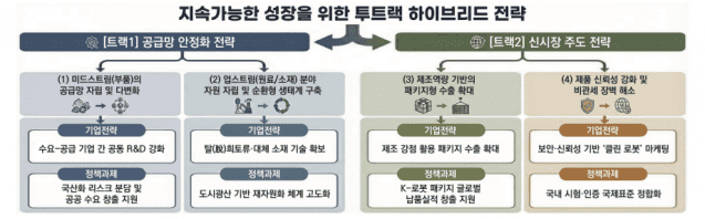 무협은 한국 로보틱스 산업의 지속 성장을 위해 '공급망 안정화'와 '신시장 주도'를 병행하는 투트랙 전략이 필요하다고 제언했다. 기업 차원에서는 핵심 소재·부품 국산화를 위한 수요·공급 기업 간 공동 연구개발(R&D) 강화와 로봇·제어·유지보수를 결합한 패키지형 수출 확대가 요구된다고 밝혔다.