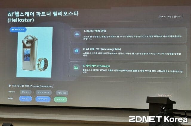 헬리오스는 ‘AI 로봇을 통한 홈 헬스케어와 보건 사회 안전망 구축’을 주제로 한 발표에서 대한민국의 급격한 인구구조 변화를 지적하며, ‘치료를 넘어 예방으로, 병원을 넘어 가정으로’를 슬로건으로 제시했다.