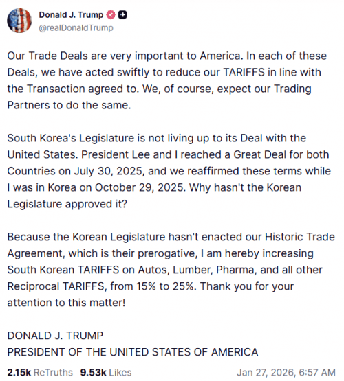 그러면서 “그들의 권한이지만 한국 국회가 우리의 역사적인 무역 협정을 입법화하지 않았다”며 “이에 따라 자동차와 목재, 의약품, 기타 모든 상호관세를 15%에서 25%로 인상한다”고 했다.
