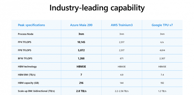 마이크로소프트 측은 마이아 200은 아마존웹서비스(AWS)의 '트레이니움(Trainium) 3세대' 대비 4비트 성능에서 3배 앞서며 구글의 '7세대 TPU'보다 뛰어난 8비트 연산 능력을 확보하며 추론 가속기 시장의 새로운 기준을 제시했다고 강조했다.