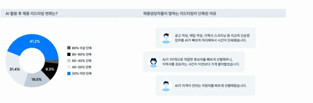 A. 평균적으로 채용 리드타임이 30% 단축되었습니다. 특히 공고 작성, 메일 작성, 이력서 스크리닝 등 단순 반복 업무에서 시간 절감 효과가 컸습니다. AI를 통한 리드타임 개선은 채용 담당자들의 기대를 뛰어넘는 성과를 보였습니다.