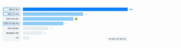 채용 업무에서 AI를 가장 많이 활용하는 분야는 채용 공고 작성으로 134회의 응답을 받아 압도적 1위를 기록했다. 이어서 채용 보고서 작성 75회, 지원자 이력서 평가 64회 등 주로 텍스트 초안 작성 영역에 AI가 집중 활용되고 있다.
