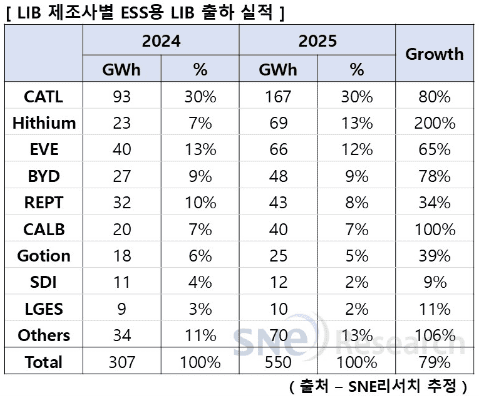 제조사별 ESS용 리튬이온배터리 출하 실적 시장점유율을 보면 중국 기업들이 상위 7위권을 차지했다. 그 중 CATL은 ESS용으로 167GWh를 출하, 전년 대비 80% 성장하며 시장점유율 30%로 1위를 차지했다.