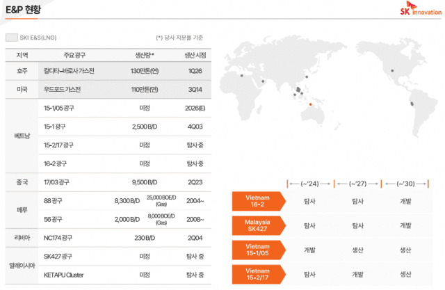 석유개발사업은 중국 17/03 광구에서 지난해 4분기 추가 2공 생산정 시추를 완료했고, 베트남 15-1 광구에서도 추가 생산정 시추를 통한 가스 증산을 계획 중이다. 베트남 15-1/05 개발광구는 올 4분기 생산 개시 예정이며, 최근 1차 평가정 시추를 성공적으로 마친 15-2/17 탐사광구의 경우 연내 3차 평가정 시추까지 완료할 계획이다. 말레이시아 SK427 탐사광구에서도 1차 탐사정 시추를 개시해 2공을 순차적으로 시추할 예정이다.