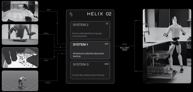 헬릭스02는 카메라로 입력된 픽셀 정보를 바탕으로 로봇 보행·조작·균형을 동시에 판단하고 실행한다. 기존 헬릭스 모델이 상체 중심 조작에 초점을 맞췄다면, 이번 버전은 하체 움직임까지 포함해 전신을 하나의 연속된 시스템으로 다룬다.