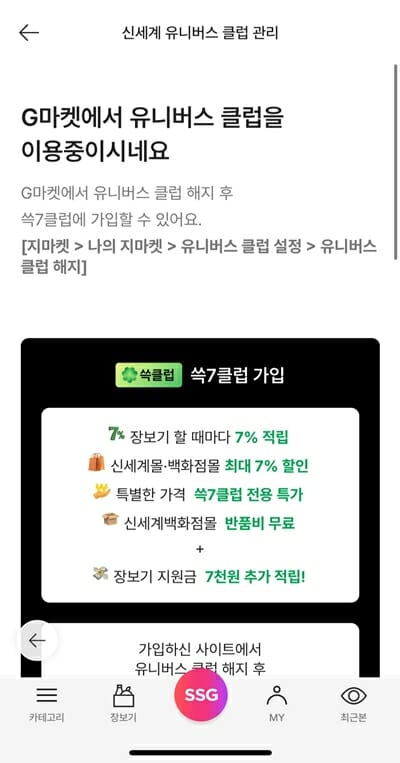 플랫폼 개별로 멤버십을 출시한 대신 중복 가입을 가능하게 만들어 고객이 원하는 혜택만 골라서 받을 수 있게 했다. 다만, 서비스 종료 예정인 신세계 유니버스 클럽과의 중복 가입은 불가능하다. 실제로 '쓱세븐클럽'에 가입하려면 신세계 유니버스 클럽을 해지 후 가입하도록 안내한다.