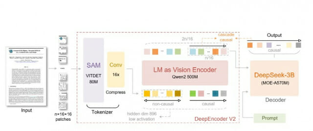 딥인코더 V2의 또 다른 특징은 이미지를 분석하는 방식을 완전히 바꿨다는 점이다. 기존에는 CLIP이라는 이미지 분석 도구를 사용했는데, 이번에는 글을 이해하는 언어 모델 구조를 이미지 분석에 적용했다. 구체적으로는 Qwen2-0.5B라는 5억 개 규모의 학습 값을 가진 모델을 사용했다. 이는 기존 CLIP의 3억 개와 비슷한 수준이라 컴퓨터 계산량을 크게 늘리지 않으면서도 효율적으로 작동한다.