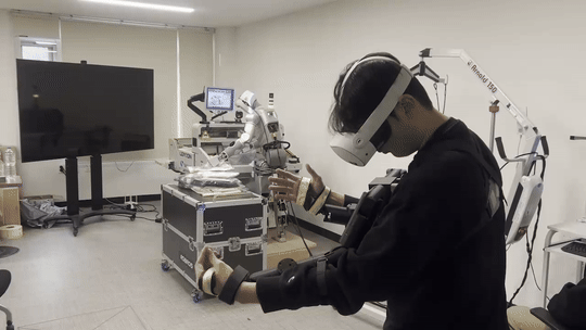 휴머노이드는 아직 스스로 작업을 완결하는 단계는 아니었다. 원격조작 기반으로 공정을 수행하며 데이터를 취득하는 방식이었다. 가상현실(VR) 기기를 활용한 텔레오퍼레이션은 이미 널리 알려져 있지만, 박 교수는 VR만으로는 한계가 있다고 봤다. VR 기반 원격조작에서 발생할 수 있는 동작 불연속(튐 현상)을 줄이기 위해 착용형 장치를 결합한 형태로 구성했다는 설명이다. 실제 산업 현장에서는 예측 불가능한 움직임이 안전 문제로 직결될 수 있기 때문이다.