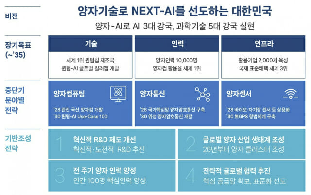 종합계획에는 '양자기술로 NEXT-AI를 선도하는 대한민국 : 양자-AI로 AI 3대 강국, 과학기술 5대 강국 실현'을 비전으로 2035년까지의 구체적인 기술개발 및 산업화 로드맵을 담았다.