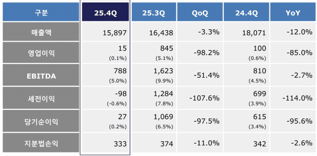 4분기 연결 기준 매출은 1조5천897억원, 영업이익은 15억원으로 전년 동기 대비 각각 12%, 85%씩 감소했다.