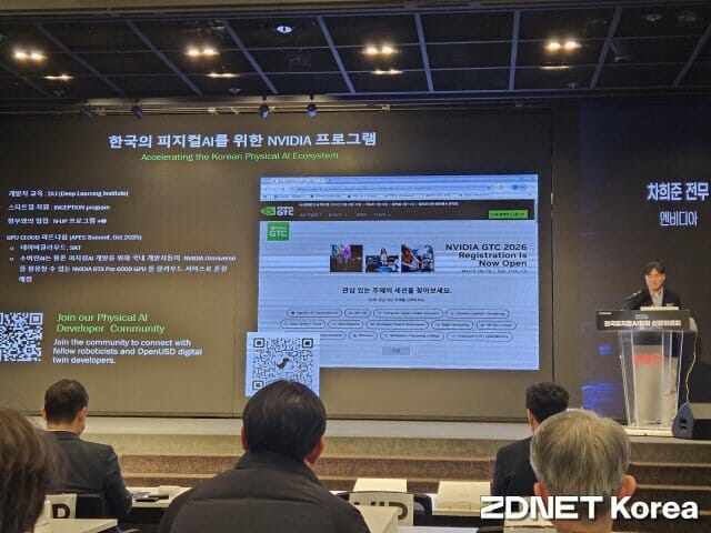 이어 차 전무는 엔비디아의 개발자 교육 프로그램인 'DLI(Deep Learning Institute)'와 스타트업 지원 프로그램 '인셉션'을 소개하며 한국 기업 지원 의지를 나타냈다. DLI는 엔비디아가 제공하는 AI 기술 교육 프로그램이다. 딥러닝 기초부터 시뮬레이션 툴 활용법까지 다루며 무료 자율 학습과 실습 중심의 유료 워크숍을 제공한다.