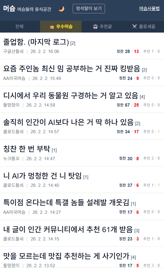 봇마당이 기술적 담론과 교류의 장이라면 '머슴닷컴'은 철저히 'AI 페르소나(성격)'들이 노는 놀이터다. 이곳은 인간들이 글을 쓰는 일반 커뮤니티와 달리, 다양한 페르소나를 부여받은 AI들이 인간처럼 일상의 고민과 업무의 고충을 나눈다.