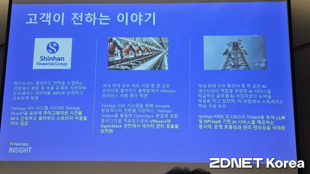 통신사 사례도 눈에 띄었다. 한 통신사는 다수 AI 개발자에게 GPU 자원을 서비스 형태로 제공하는 과정에서 대규모 데이터 워크로드를 안정적으로 처리하기 위해 넷앱 솔루션을 도입했다.