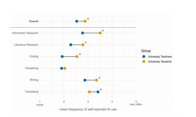 연구 결과에 따르면, 학생들은 교수들보다 학술 과제에서 AI를 더 자주 사용하는 것으로 나타났다. 5점 척도 기준으로 학생들의 AI 사용 빈도는 교수보다 평균 0.35점 높았으며, 이는 통계적으로 유의미한 차이였다. 연구진은 정보 검색, 문헌 조사, 프로그래밍, 글쓰기, 시각화, 번역 등 6개 학술 과제를 대상으로 분석을 진행했다.