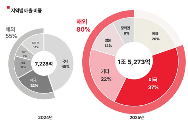 연간 기준으로는 해외서 발생한 매출이 실적의 중심이 됐다. 신 CFO는 “해외에서 전년 동기 대비 207% 상승한 1조 2258억 원의 매출을 기록했다”며 “전체 매출에서 해외 매출이 차지하는 비중은 24년 55%에서 25년 80%로 성장했다”고 말했다. 이어 “미국에서의 폭발적 성장 흐름이 자연적으로 글로벌로 확산됐다"고 덧붙였다.