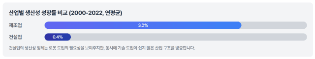 건설업의 생산성 정체는 로봇 도입의 필요성을 보여주지만, 동시에 기술 도입이 쉽지 않은 산업 구조를 방증합니다.