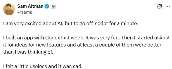 그는 코덱스 앱을 시연한 경험을 언급하며 "AI가 스스로 게임을 만들고 배포하는 것을 보며 경이로움과 동시에 쓸모 없음과 슬픔을 느꼈다"고 토로했다.