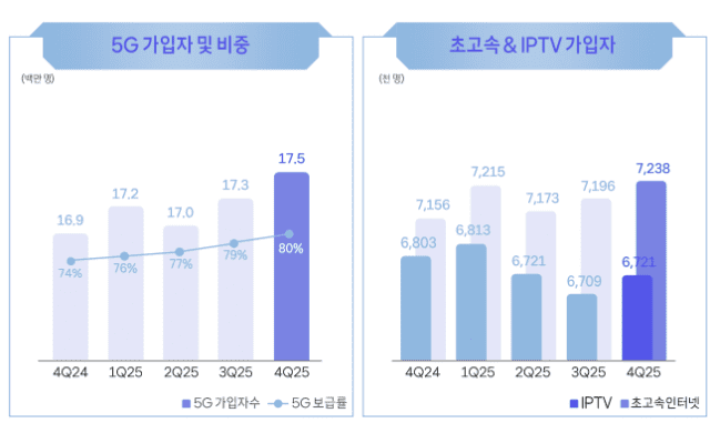 연말 기준 전체 핸드셋 가입자는 2273만이며 5G 가입자 비중은 80%에 올랐다. 연말 기준 총 무선 가입자는 3337만이다.