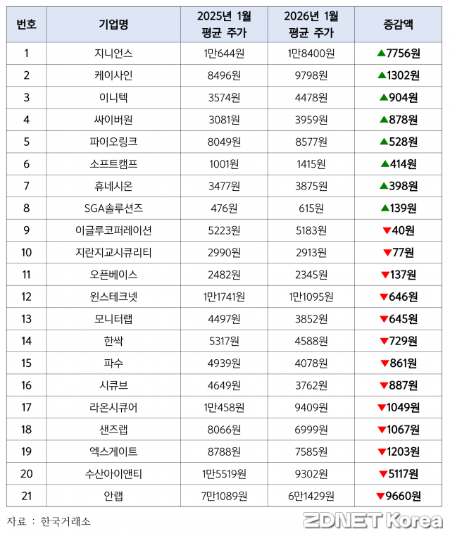 한편 이글루코퍼레이션과 지란지교시큐리티의 2025년 1월 대비 올해 1월 월 평균 주가가 각각 40원(-0.77%), 77원(-2.58%) 하락해 1년 동안 비슷한 수준을 유지한 것으로 나타났다. 오픈베이스는 지난해 1월 월 평균 주가가 2482원을 기록했으나 1년이 지난 시점인 올해 1월 기준 월 평균 주가가 2345원으로 137원(-5.52%) 소폭 하락했다.