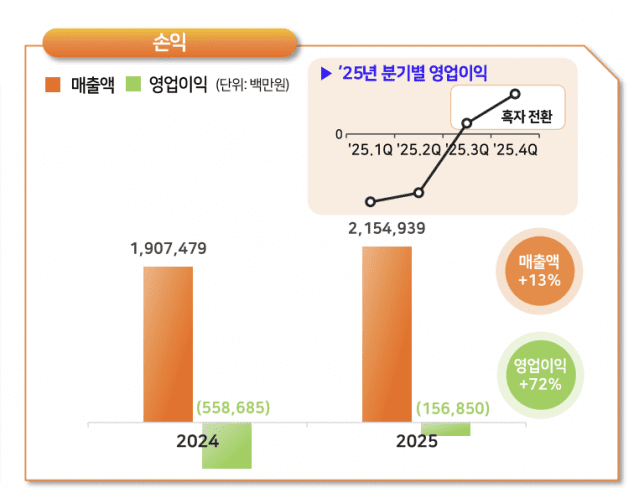 수익성 측면에서도 개선 흐름이 이어질 것으로 봤다. 류 CFO는 “출하량 증가와 판가 안정화를 바탕으로 매출 성장세가 지속될 것”이라며 “원재료 가격 변동 등 외부 요인을 제외하더라도 영업이익 흑자 흐름이 상반기까지 이어질 것으로 예상한다”고 말했다. 이어 “기존 재고자산 소진도 병행되면서 손익 회복 흐름을 보다 안정적으로 보여줄 수 있을 것”이라고 덧붙였다.