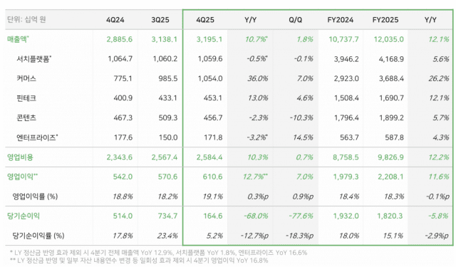 구체적으로 4분기 사업 부문별 매출액은 ▲서치플랫폼 1조596억원 ▲커머스 1조540억원 ▲핀테크 4531억원 ▲콘텐츠 4567억원 ▲클라우드 1718억원이다.