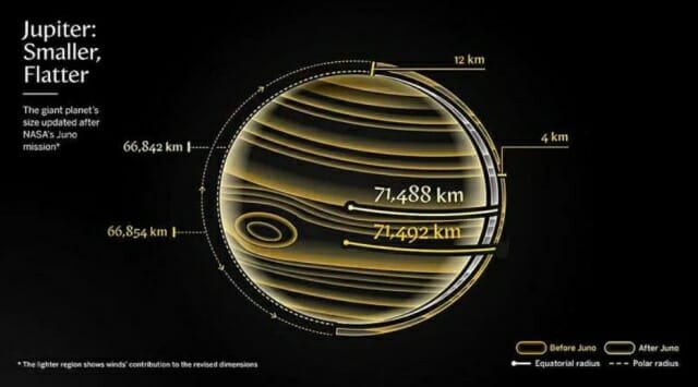새로운 분석 결과, 목성의 평균 반지름은 6만6842㎞로 산출됐다. 이는 기존 측정치보다 약 12㎞ 작은 수치다. 적도 반지름 역시 7만1488㎞로, 이전 추정값보다 약 4㎞ 감소한 것으로 나타났다.