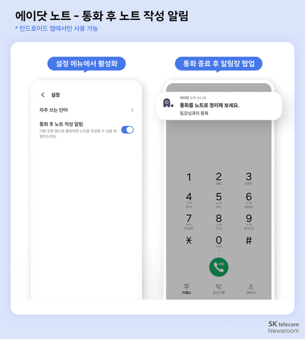 SK텔레콤은 AI 서비스 에이닷 노트에 리더 발언 중심으로 회의를 기록하는 ‘리더 회의록’과 개인 음성 메모를 분석하는 ‘생각 노트’ 템플릿 2종을 추가했다고 밝혔다.