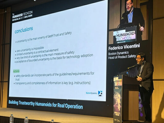 아울러 제조사와 사용자 간 신뢰 구축을 위해 로봇의 잔여 위험과 조건을 숨기지 않고 공유하는 투명성이 필수적이라고 전했다. 그는 "신뢰와 안전 요소를 산업 전체가 공유할 수 있도록 국제 안전 표준 마련이 필요하다"며 "표준은 휴머노이드 기술이 산업에 채택되기 위한 글로벌 계약의 기반이 될 것"이라고 말했다.