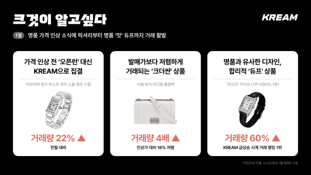 크림 관계자는 “명품 가격 인상이 이어지는 환경 속에서 소비자들은 보다 전략적인 소비 방식을 선택하고 있다”라며 “크림에서는 럭셔리 거래 확대와 듀프 소비 증가가 동시에 관측되면서 소비 트렌드가 더욱 세분화되고 있음을 보여준다”라고 말했다.