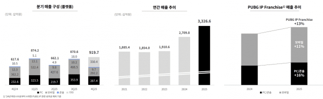 모바일 부문에서는 배틀그라운드 모바일이 새로운 테마 모드 도입과 'WoW' 이용자 제작 콘텐츠(UGC) 업데이트를 통해 핵심 팬덤 저변을 지속적으로 확대하며 성장했다. 배틀그라운드 PC·콘솔과의 공동 협업을 통해 PUBG IP 프랜차이즈 전반의 선순환 구조를 구축하며 성장 동력을 공고히 한 점도 실적 상승세를 뒷받침했다. '배틀그라운드 모바일 인도'(이하 BGMI) 역시 인도 한정 스킨 및 맞춤형 프리미엄 아이템, 현지 유명 브랜드와의 전략적 협업을 통해 국민 게임으로서의 입지를 공고히 하며 안정적인 성장 흐름을 이어갔다.