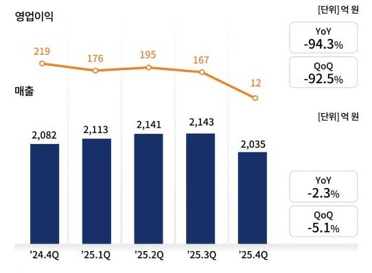 같은 기간 매출은 2천35억원으로 2.3% 감소했다. 지난해 매출은 2천억원 초반대를 유지했지만, 영업이익은 4분기 들어 크게 축소됐다.