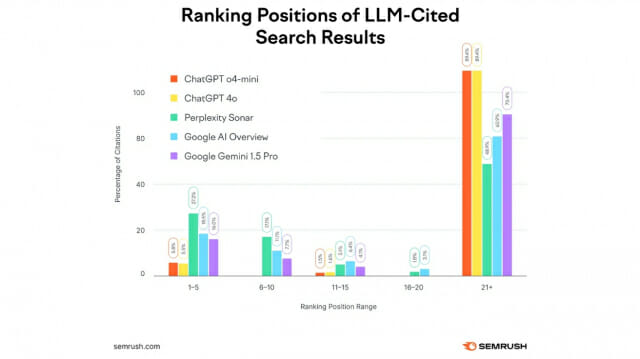 챗GPT 검색이 웹페이지를 인용할 때, 인용하는 페이지는 관련 쿼리에 대한 전통적인 자연 검색 순위에서 21위 이상에 위치하는 경우가 거의 90%에 달한다. 퍼플렉시티와 구글의 LLM도 전통적인 검색 결과에서 낮은 순위의 페이지를 자주 인용한다.
