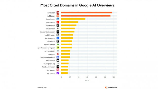 셈러시의 AI 검색 연구에 따르면 쿼라(Quora)는 구글 AI 오버뷰에서 가장 많이 인용되는 웹사이트다. 레딧(Reddit)이 2위를 차지했다. 쿼라와 레딧 사용자들은 다른 곳에서 다루지 않는 틈새 질문을 하고 답변하는 경우가 많다. 이로 인해 매우 구체적인 AI 프롬프트에 대한 풍부한 정보 소스가 된다. 특히 레딧은 구글과 파트너십을 맺고 AI 학습 데이터를 제공하고 있어 높은 인용률을 기록하고 있다.