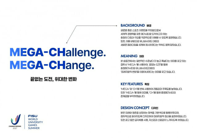 2027 충청 유니버시아드대회 조직위원회는 대국민 선호도 조사를 거쳐 대회 공식 슬로건을 ‘Mega-Challenge Mega-Change’로 확정했다고 11일 밝혔다.