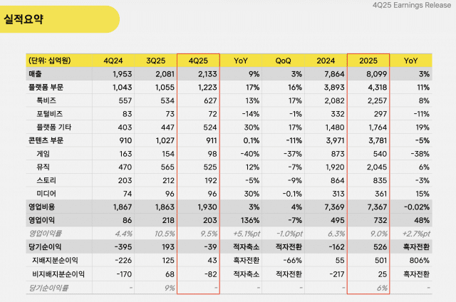 콘텐츠 부문의 4분기 매출액은 9106억원으로, 전년 동기와 유사한 수준을 기록했다. 뮤직과 미디어 매출액은 전년 동기 대비 각각 12%, 30% 증가한 5251억원, 958억원을 기록했다. 스토리 매출은 1918억원으로, 전년 동기 대비 5% 감소했다.