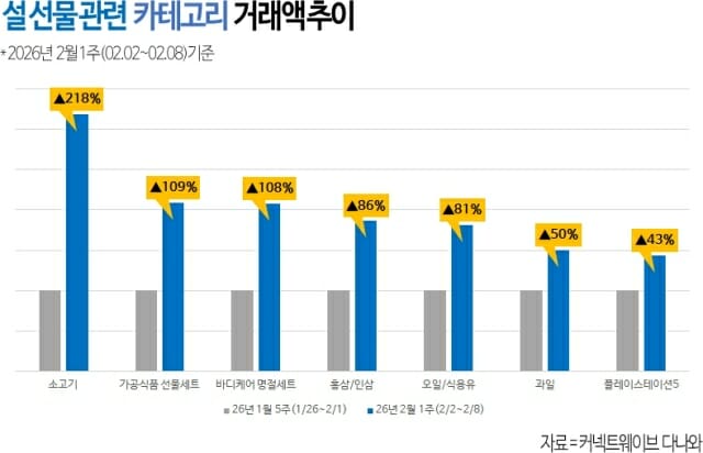 고가 선물로 분류되는 '소고기(한우 등)' 거래액은 전주(1월 26일~2월 1일) 대비 3배 이상, 명절 제수용 및 선물용 수요가 집중되는 '과일' 거래액도 전주 대비 50% 늘어났다.